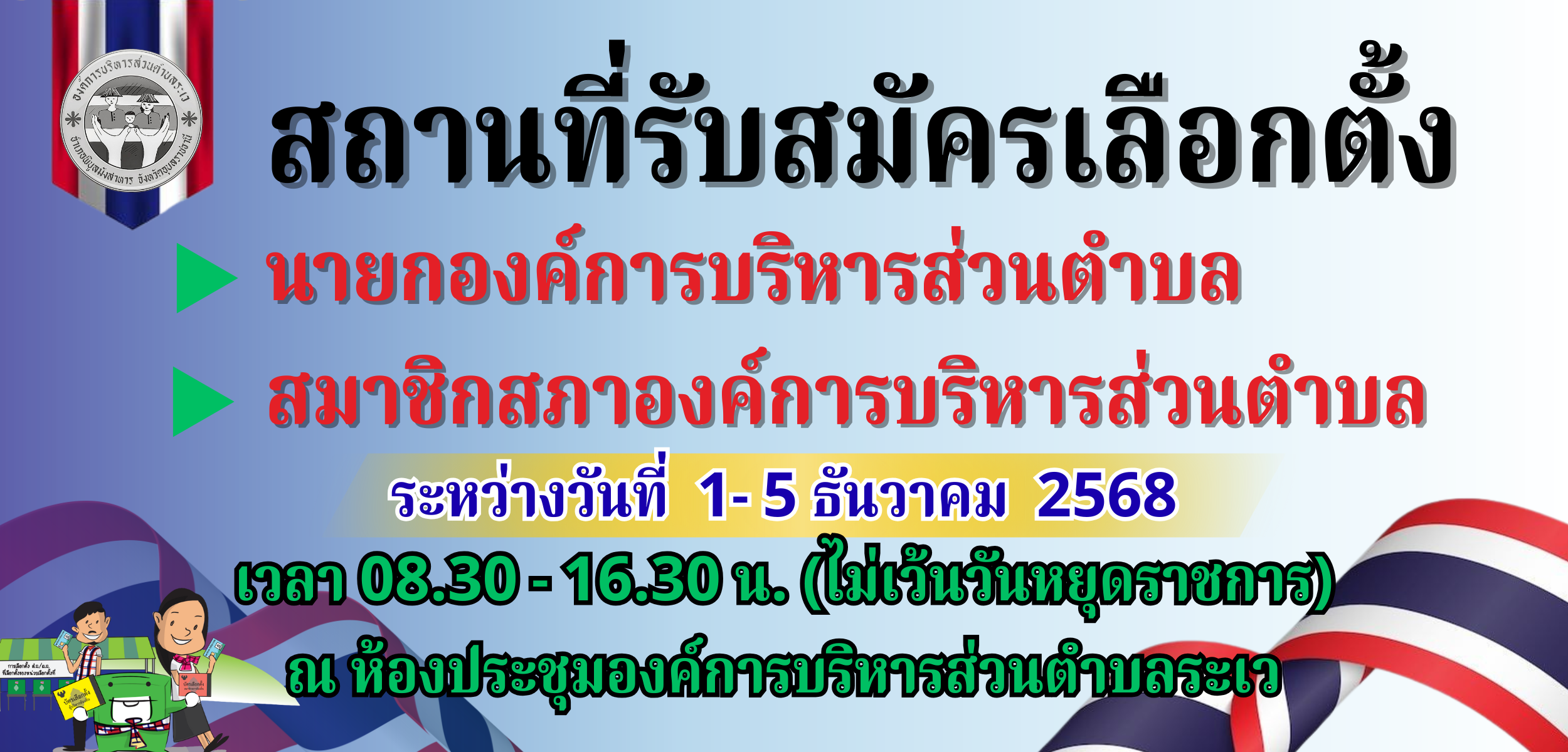วันพุธ, 26 พฤศจิกายน 2568 15:56 ประชาสัมพันธ์ สถานที่รับสมัครสมาชิกสภาองค์การบริหารส่วนตำบลระเว และนายกองค์การบริหารส่วนตำบลระเว ซึงจะในระหว่างวันที่ 1 - 5 ธันวาคม 2568 เวลา 08.30 - 16.30 น. (ไม่เว้นวันหยุดราชการ) สามารถสมัครได้ที่ ห้องประชุมสภาองค์การบริหารส่วนตำบลระเว
