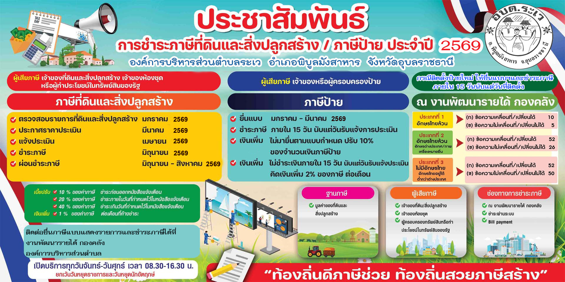 กองคลัง งานจัดเก็บรายได้ราย องค์การบริหารส่วนตำบลระเว ประชาสัมพันธ์ การชำระภาษีที่ดินและสิ่งปลูกสร้าง/ภาษีป้าย ประจำปี 2569