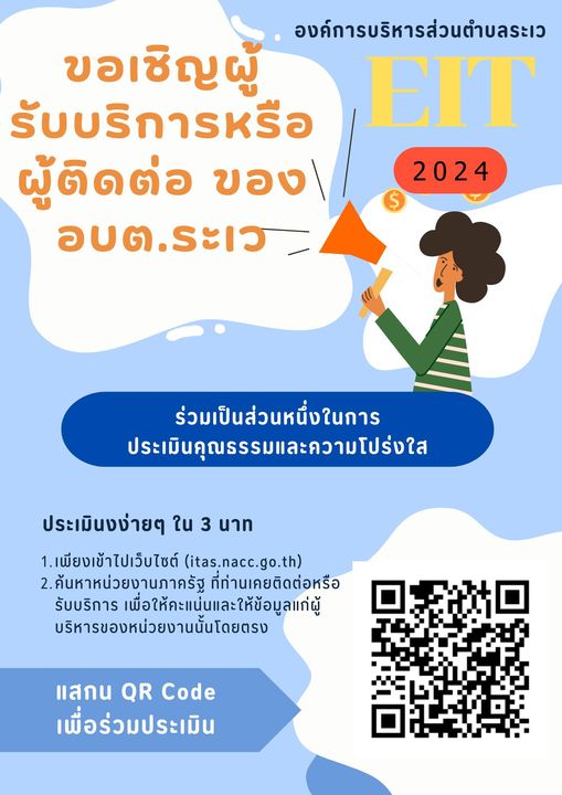 ขอเชิญผู้มารับบริการหรือติดต่อกับองค์การบริหารส่วนตำบลระเว ร่วมเป็นส่วนหนึ่งในการประเมินคุณธรรมและความโปร่งใส 2567